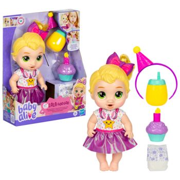 LaLa GooGoo can't wait to celebrate her first birthday with the Birthday Bestie set! Kids can play pretend and host their own make believe parties again and again with this Baby Alive doll playset. Get her party ready with the hat/headband to go with her adorably fashionable outfit. Kids will also love to blow out the candle on the cupcake toy that they can reset to play over and over. Give her a juice box break and she'll really drink water, but don't forget to change her diaper when she wets! If you're looking for preschool toys for girls 3-5 or even nurturing boys toys, this baby doll set lets kids celebrate imaginative play with their little bestie again and again.