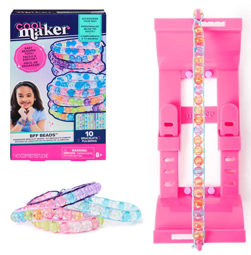 Be an everyday maker with the Cool Maker BFF Beads Friendship Bracelet Maker. This all-in-one bracelet kit comes with everything kids need to easily create 10 stylish friendship bracelets, including 230 beads, 4 colors of cord and a mini bracelet maker. Beading with the kit is easy: measure your wrist, place a cord on the studio, weave bracelet beads through the cord and trim. With 8 different colors of translucent beads to choose from, kids can customize and design bracelets any way want, and wear and share with their friends. Whether you’re looking for engaging kids activities for sleepovers, birthday parties, back-to-school, rainy days or for every day, Cool Maker crafts for kids are a welcome addition to jewelry making supplies and craft supplies. For more ways to create with Cool Maker, look for the Stack’d Heishi Bracelet Maker and other craft kits like Chic Chimes, Sweetheart Handbag and more (each sold separately). Bead colorful friendship bracelets with the Cool Maker BFF Beads Friendship Bracelet Maker.