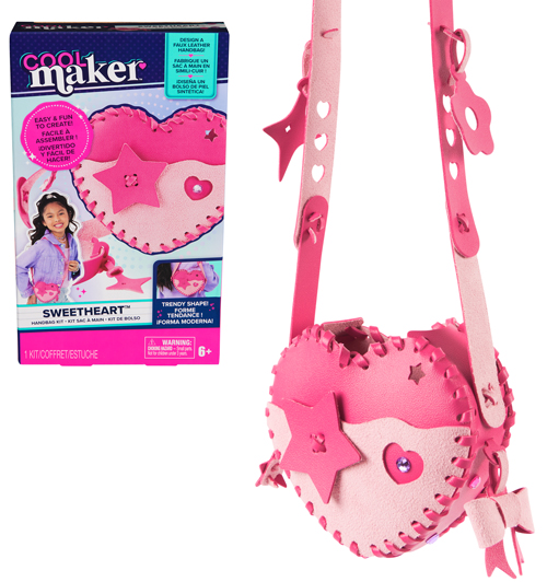 Be an everyday maker with the Cool Maker Sweetheart Handbag Kit. This all-in-one kit comes with everything kids need to easily design their own heart-shaped purse including precut pieces of faux leather, extra precut add-ons and gems to customize. Assembling the bag is easy: follow the simple instructions and use the strings to weave pieces together, then adjust the strap to the preferred length for wearing. Girls can choose between 6 gems and 3 precut charms – star, flower and bow – to add the finishing touches to their purse, customizing it any way they want. Once finished, store essentials inside and accessorize any look with your new, stylish bag. Whether you’re looking for engaging kids activities for sleepovers, birthday parties, back-to-school, rainy days or for every day, Cool Maker crafts for kids are a welcome addition to jewelry making supplies and craft supplies. For more ways to create with Cool Maker, look for the Stack’d Heishi Bracelet Maker and other craft kits like Chic Chimes, BFF Beads and more (each sold separately). Design your own leather handbag with the Cool Maker Sweetheart Handbag Kit.