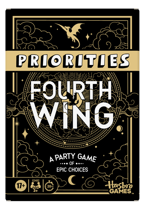 Welcome to Basgiath, cadet! See how well you know your squadmates in this Priorities Fourth Wing Edition game, inspired by the bestselling Empyrean series by Rebecca Yarros! In this game of epic choices, one player—the Wingleader—draws 5 cards featuring favorites from the first 3 Empyrean books: Fourth Wing, Iron Flame, and Onyx Storm. They secretly rank the cards from love to loathe. Everyone else—the Iron Squad—works together to guess the Wingleader’s order. It’s everyone versus the game! Earn a card for every correctly guessed rank, and the game earns the rest. To win, spell PRIORITIES using the letters on the backs of your earned cards before the game does. Looking for Fourth Wing gifts, dragon games, or group games for adults? Rank this Priorities game at the top of your list! Fourth Wing party games are also great travel games for camping, bachelorette parties, and Threshing day.